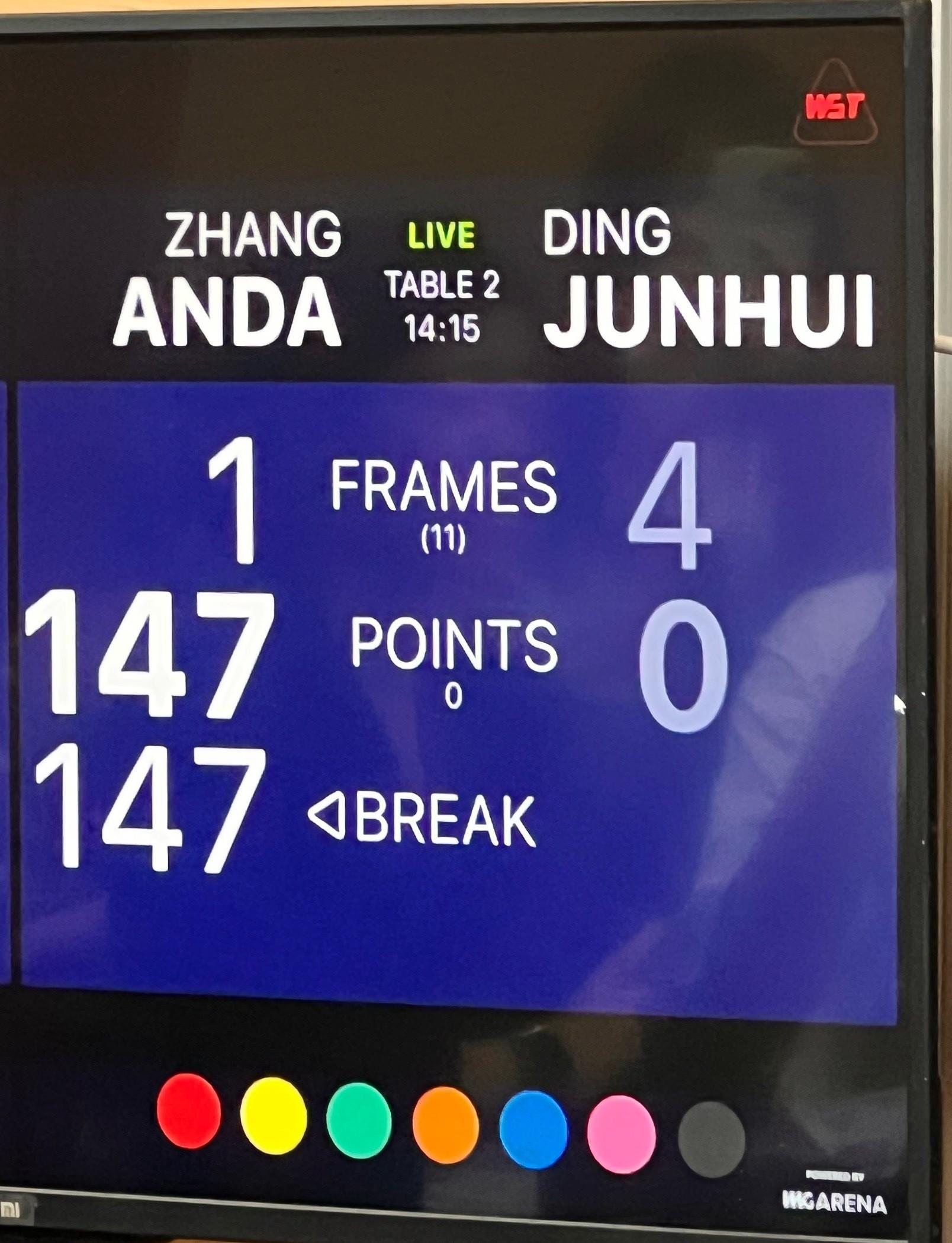 本場比賽第六局,張安達轟出單杆147分,這是他個人職業生涯的第四杆147,也是本賽季的第二杆147,本賽季的第一杆147是由另一位中國選手範爭一打出的。