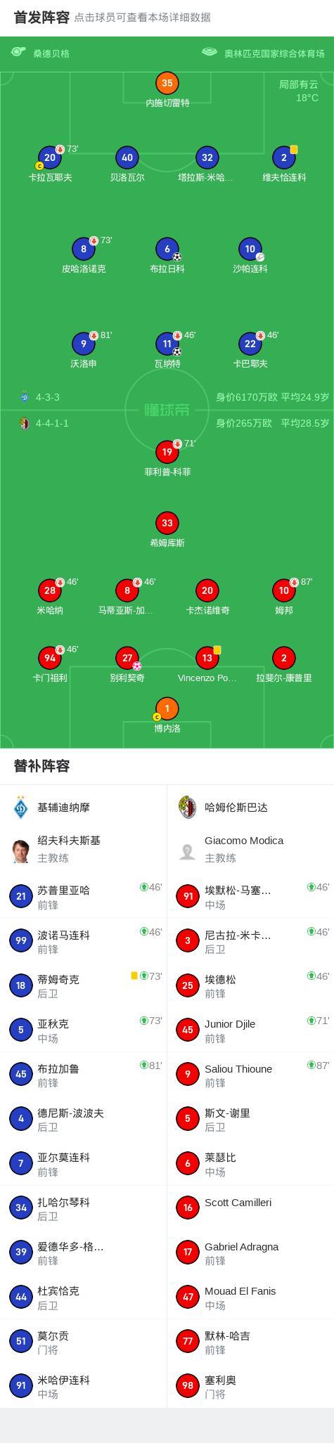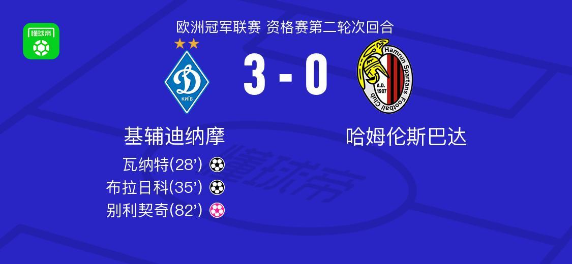 北京時間7月30日,歐洲冠軍聯賽資格賽第二輪次回合,基輔迪納摩對陣哈姆倫斯巴達。比賽進行中,基輔迪納摩球員瓦納特率先破門,隨後沙帕連科送出助攻,布拉日科再下一城。比賽尾聲階段,哈姆倫斯巴達球員別利契奇自擺烏龍,將球誤入自家球門。最終,基輔迪納摩以3比0戰勝哈姆倫斯巴達。兩回合總比分基輔迪納摩6比0淘汰對手。