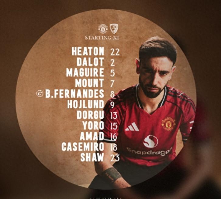 曼聯vs伯恩茅斯:B費、芒特、馬奎爾首發