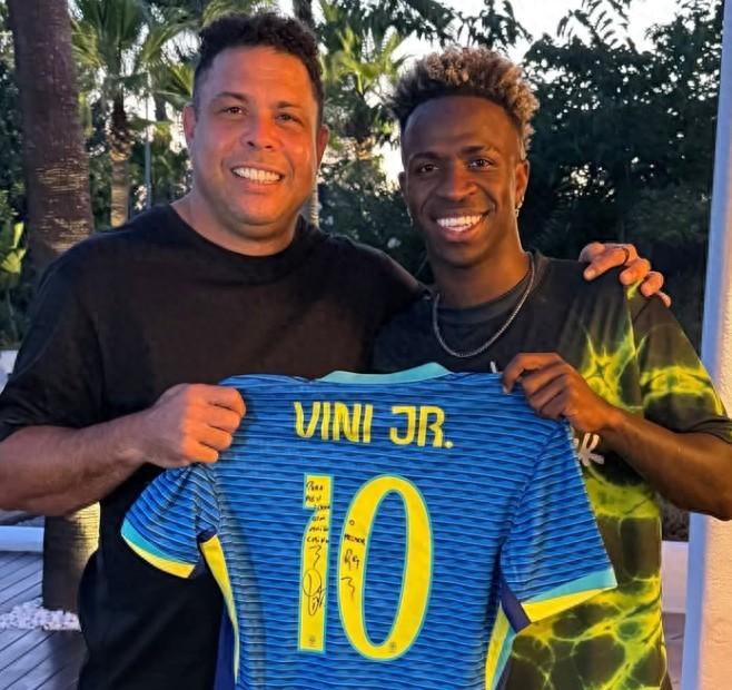 在維尼修斯曬出的這張合影中,他與大羅一同展示了一件印有他名字的巴西國家隊10號球衣,上面似乎還有大羅寫給維尼修斯的寄語。