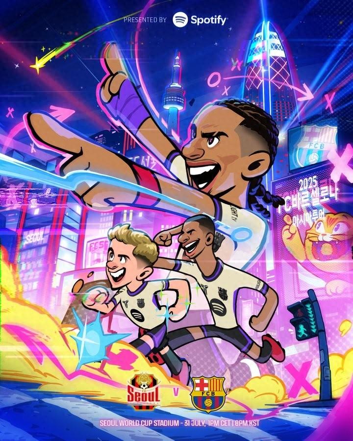 巴薩本次的預熱海報採用全新的卡通風,其中加維、拉什福德和拉菲尼亞出鏡,背景是首爾城市的大樓,巴薩官方配文:“第二場季前賽!”
