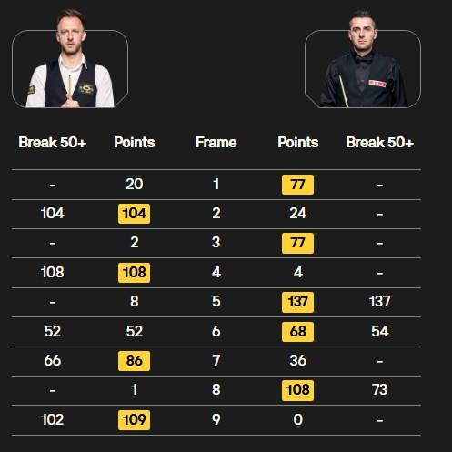 上半場比賽中,塞爾比先下一局,隨後小特單杆104分扳平,第三局塞爾比再次拿下,第四局小特單杆108分拿下,上半場結束雙方2-2戰平。