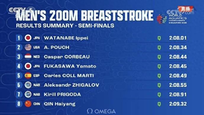 男子200米蛙泳半決賽:覃海洋2分09秒32,小組第三晉級決賽