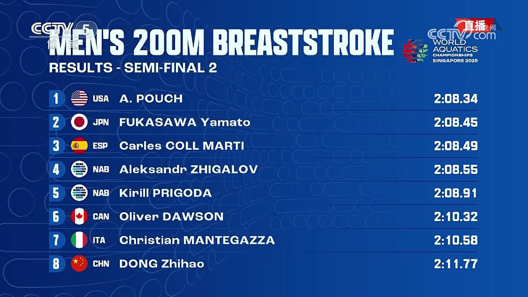 7月31日,游泳世錦賽男子200米蛙泳半決賽,覃海洋第一組出發,2分09秒32獲得小組第三;董志豪第二組出發,獲得小組第八。最終覃海洋晉級決賽。