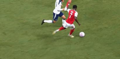 第35分鐘,本坦庫爾放倒薩卡,被出示黃牌