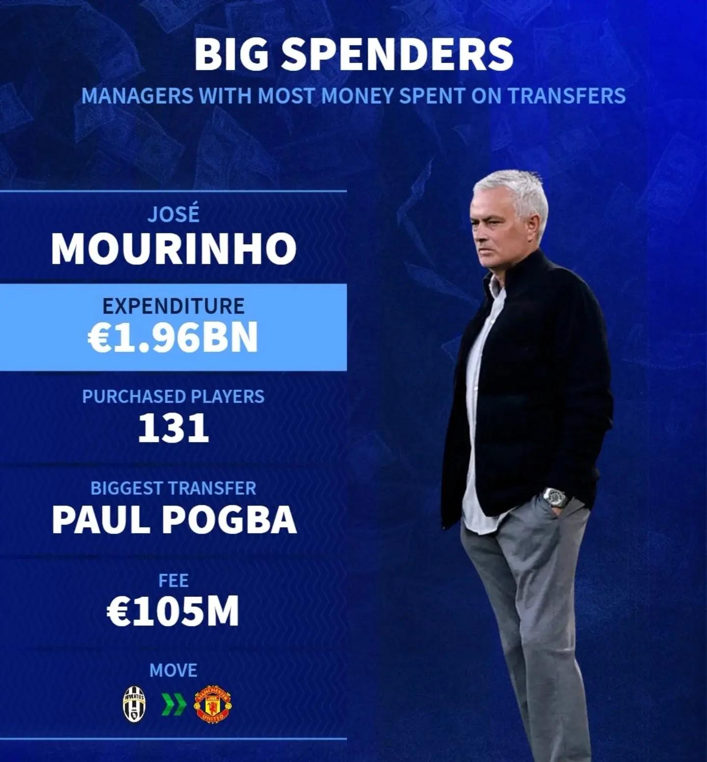 德轉列主教練引援總花費前五:瓜帥接近25億歐第一,穆帥第二