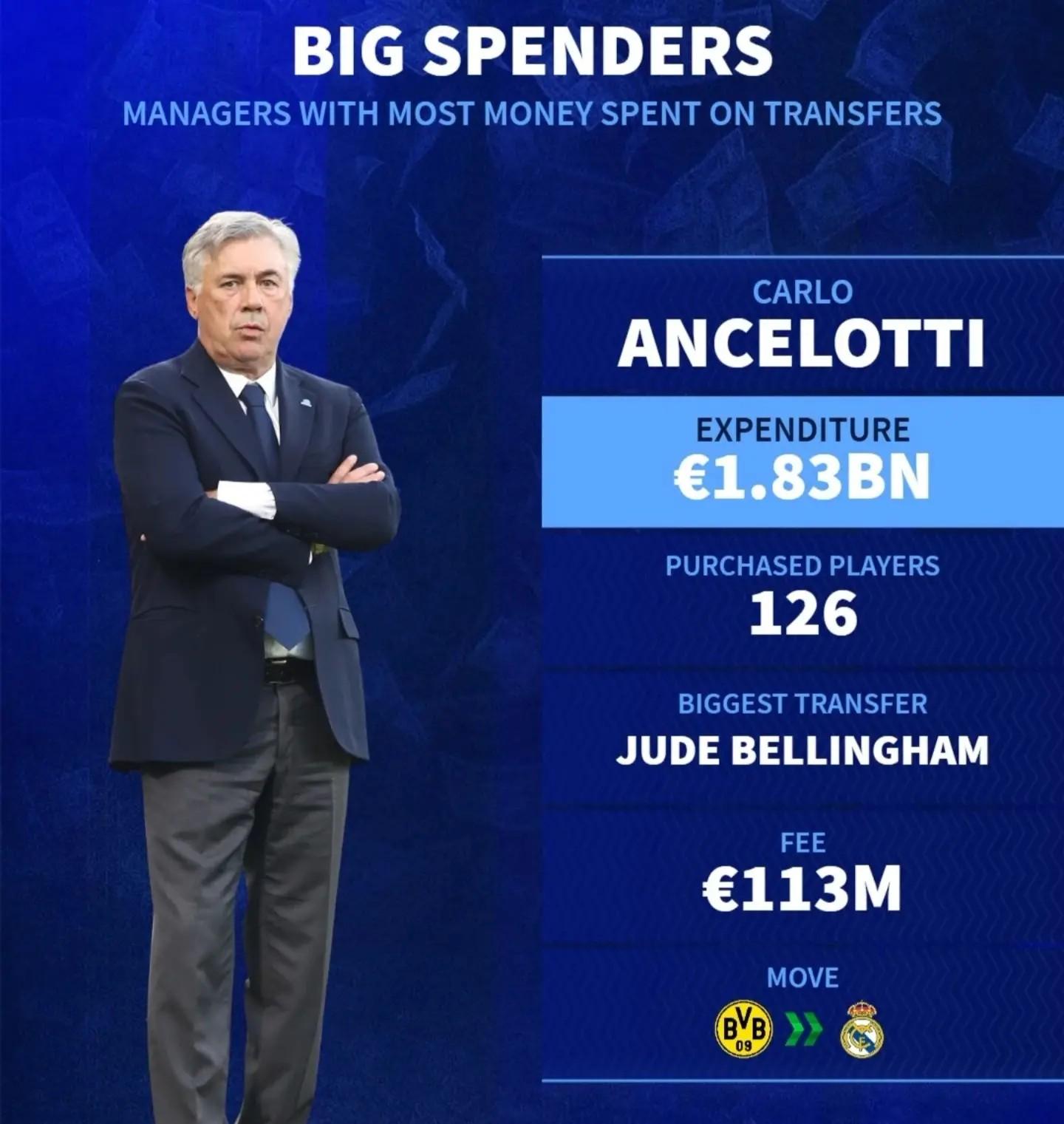 3. 安切洛蒂(雷吉亞納、帕爾馬、尤文圖斯、AC米蘭、切爾西、巴黎聖日耳曼、皇家馬德里、拜仁慕尼黑、那不勒斯、埃弗頓)