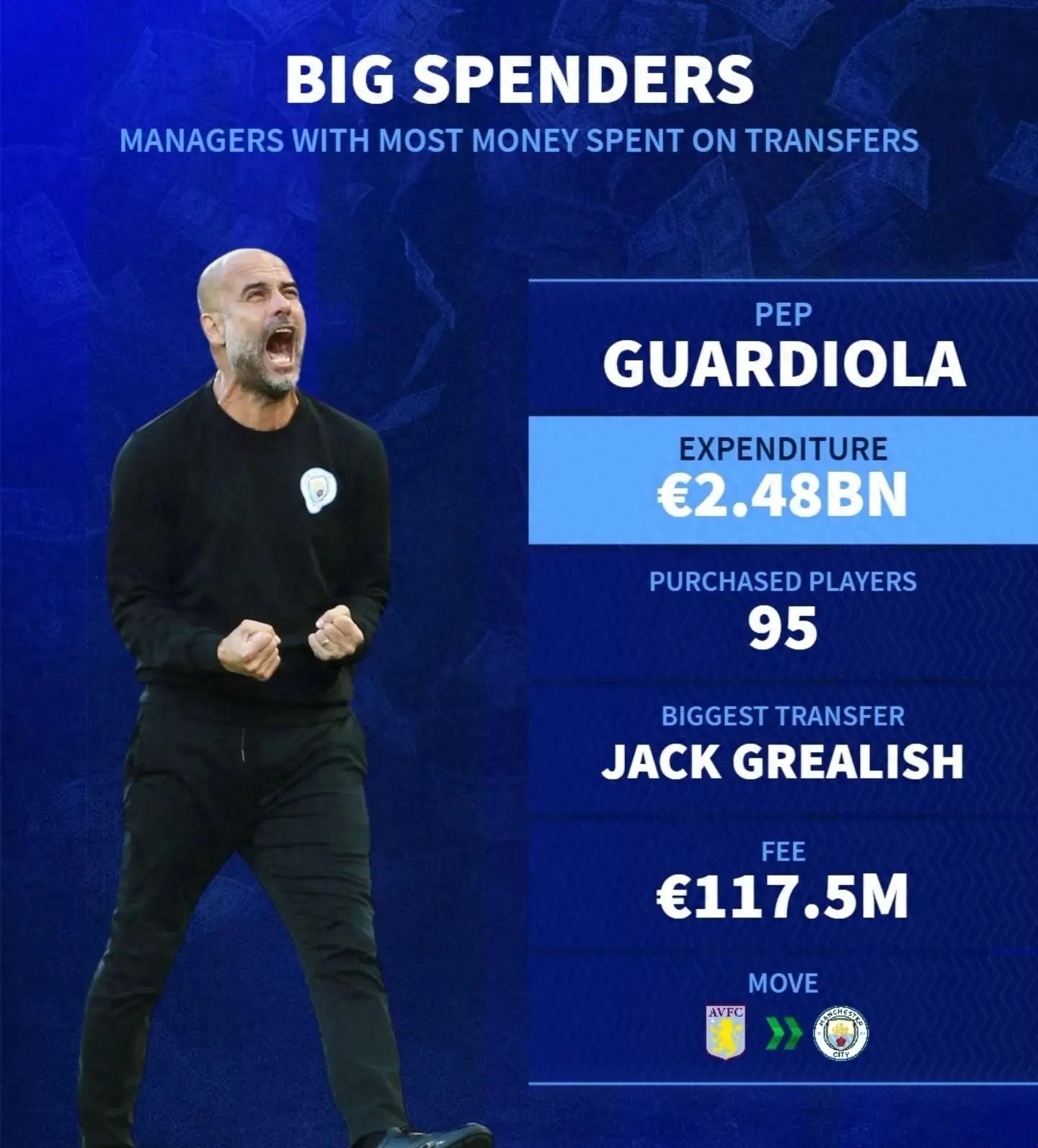 北京時間8月1日,德轉統計出了世界足壇引援花費最高的5位主教練,瓜迪奧拉接近25億歐元高居第一,穆里尼奧第二,安切洛蒂第三。