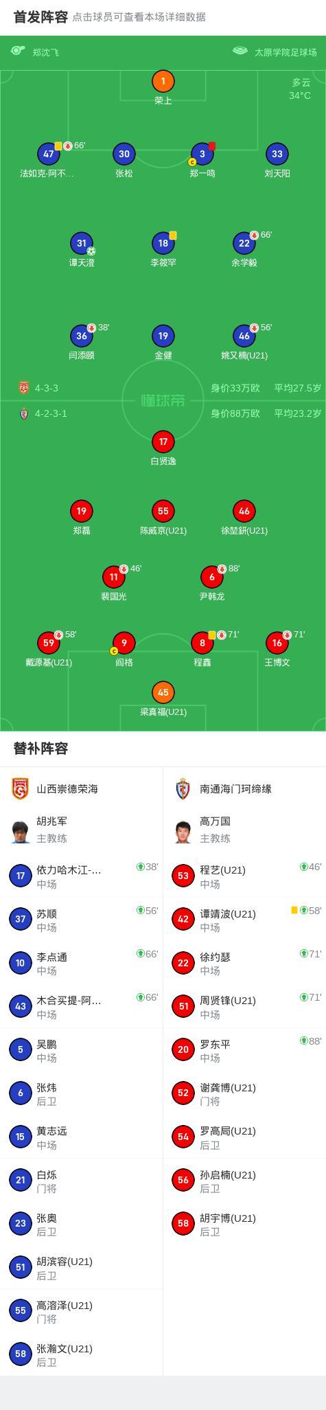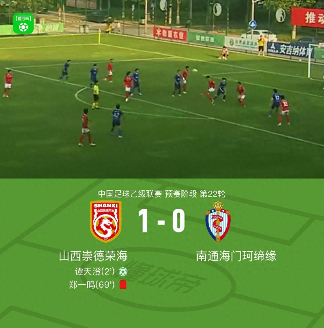 北京時間8月2日中國足球乙級聯賽 預賽階段 第22輪,山西崇德榮海主場對陣南通海門珂締緣。山西崇德榮海譚天澄破門。最終比分山西崇德榮海 1-0 海門珂締緣。