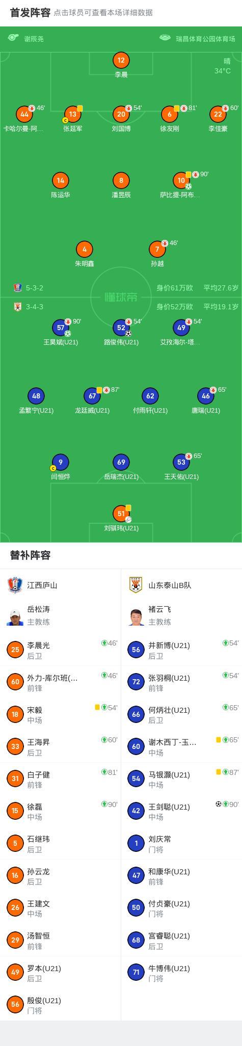8月2日,中國足協乙級聯賽預賽階段第22輪,江西廬山坐鎮主場迎戰山東泰山B隊。比賽中,山東泰山B隊由路俊偉率先破門,隨後江西廬山由薩比提-阿布都沙拉木通過點球扳回一城。山東泰山B隊的王昊斌主罰點球命中,進一步擴大領先優勢。比賽進入補時階段,劉騏瑋送出助攻,王劍聰推射破門,爲山東泰山B隊鎖定勝局。最終,江西廬山以1比3不敵山東泰山B隊。
