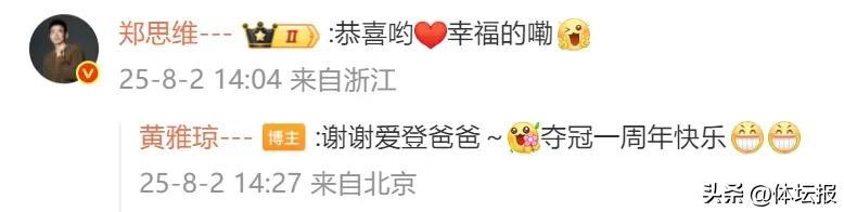 網友們表示官宣時間選得真好,不僅公佈時間是13:14,今天也是全運會倒計時99天。131499很圓滿!值得一提的是,今天正是黃雅瓊巴黎奧運會奪冠一週年,也是劉雨辰向黃雅瓊求婚一週年。