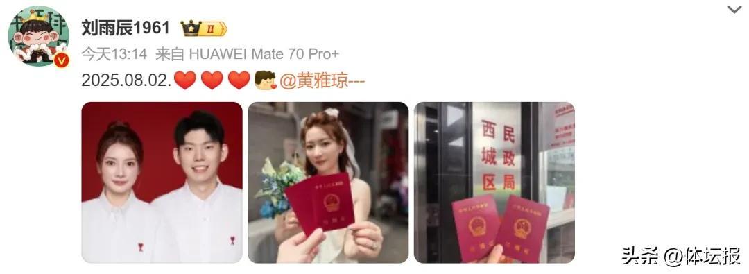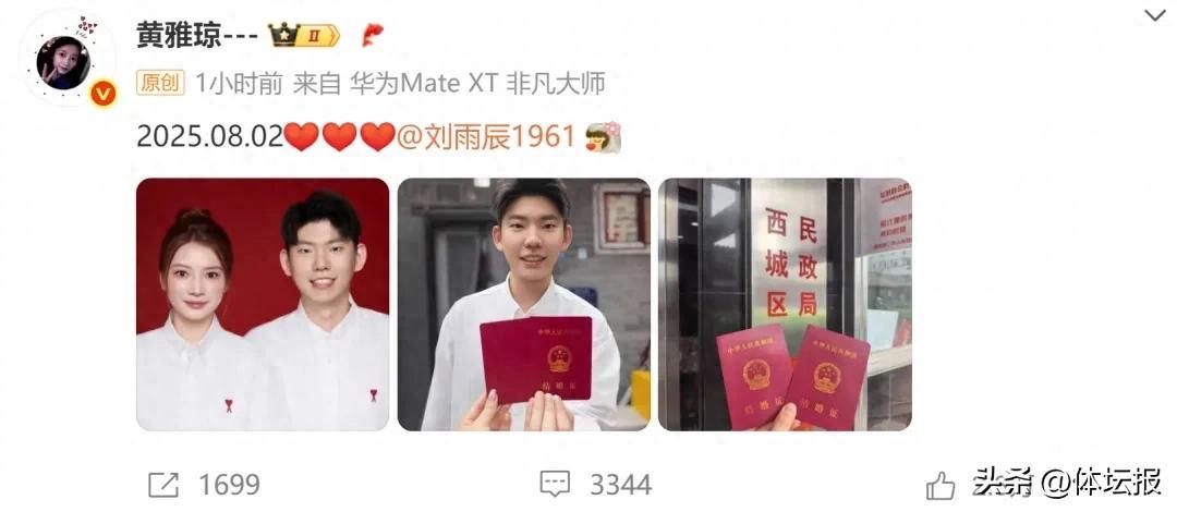 8月2日下午13:14,奧運冠軍、浙江羽毛球運動員黃雅瓊更新個人社交媒體動態,官宣與劉雨辰正式領證。