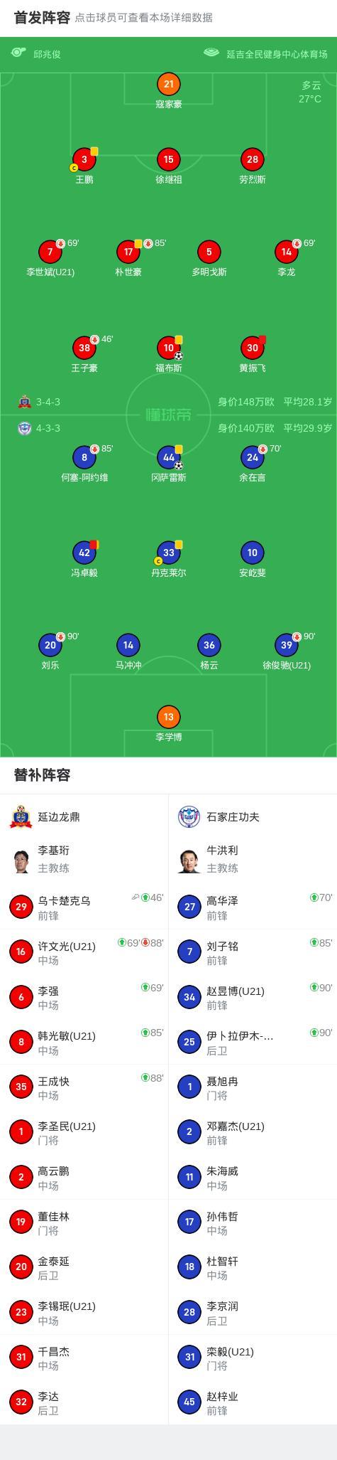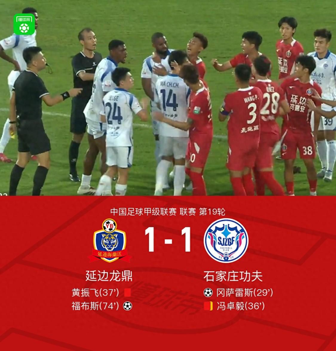 延邊龍鼎1-1石家莊功夫,岡薩雷斯、福布斯破門,馮卓毅、黃振飛染紅