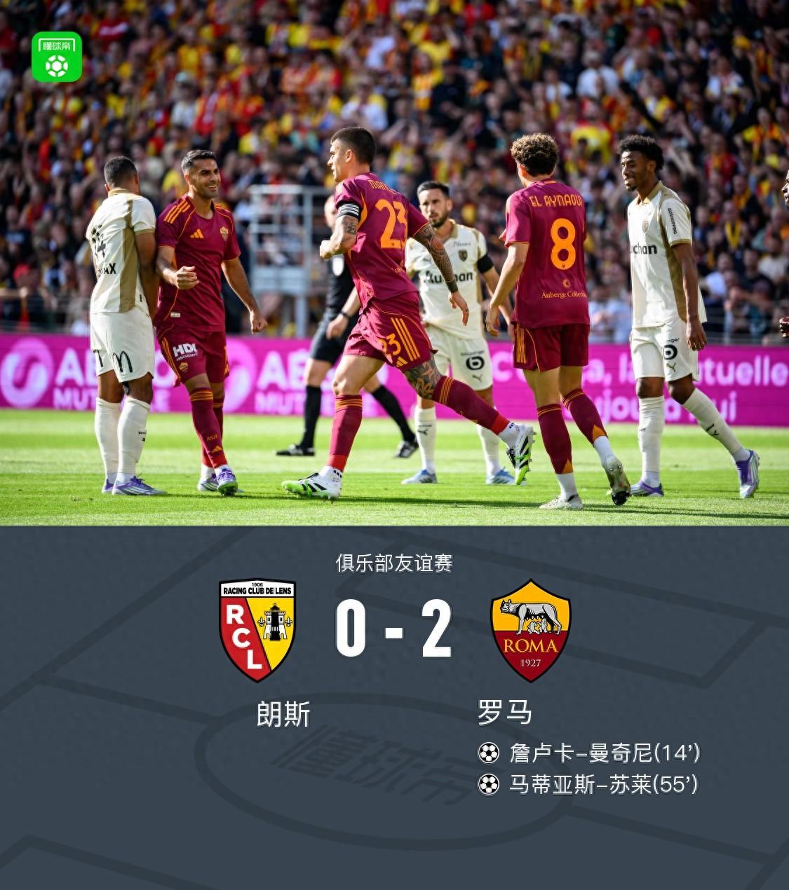 北京時間8月3日俱樂部友誼賽,朗斯對陣羅馬。上半場,曼奇尼在任意球進攻中率先破門。下半場,蘇萊建功擴大領先優勢。全場比賽結束,羅馬2-0戰勝朗斯。