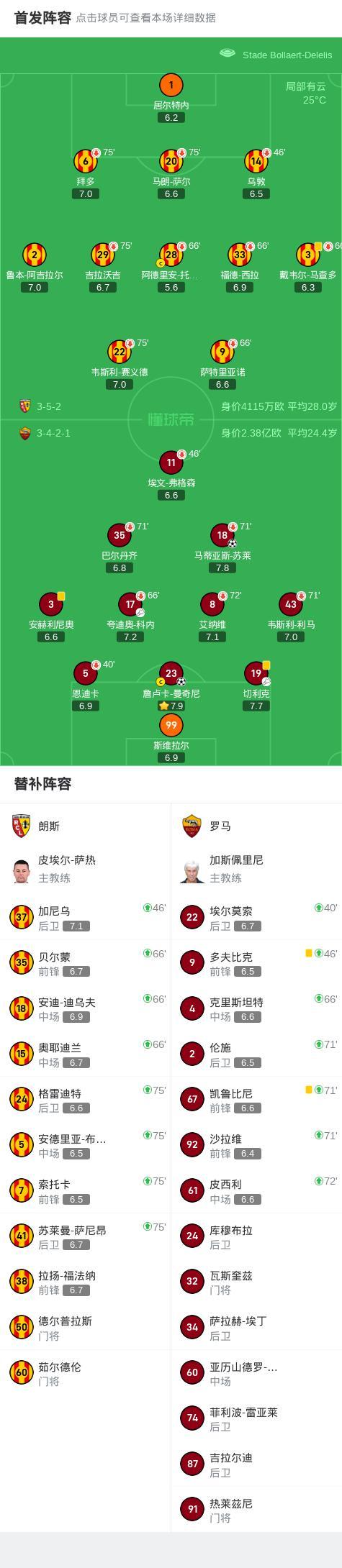 羅馬2-0朗斯,曼奇尼破門,蘇萊建功,科內、切利克助攻