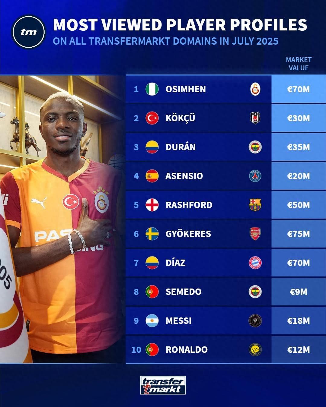 北京時間8月3日,德國轉會市場官方統計了7月球員頁面瀏覽量排行榜,其中奧斯梅恩第一,拉什福德、路易斯-迪亞斯、哲凱賴什等人在列。