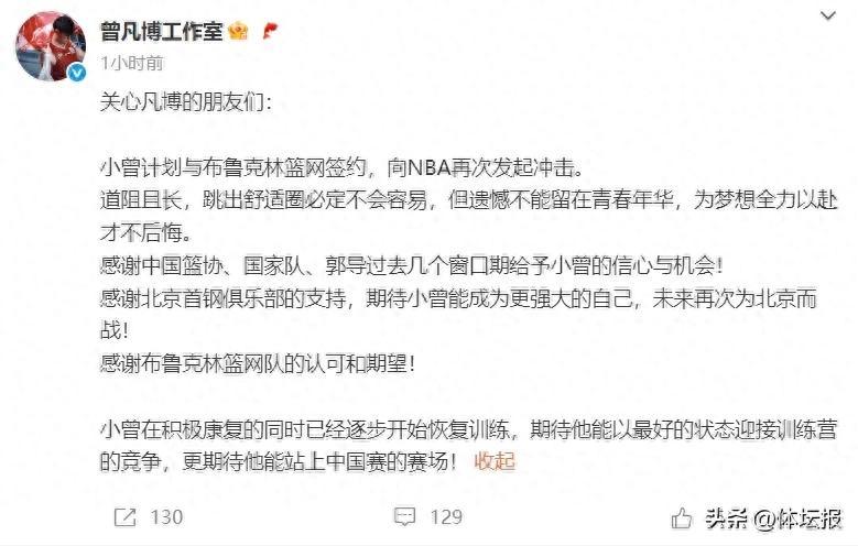 Scotto寫道:“籃網已與CBA最有前途的球員之一曾凡博達成協議。這位22歲、身高6英尺10英寸的前鋒在效力北京首鋼隊期間,場均得到14.7分,投籃命中率53%,三分球命中率41%,此外還有4.6個籃板和1.6個蓋帽。”