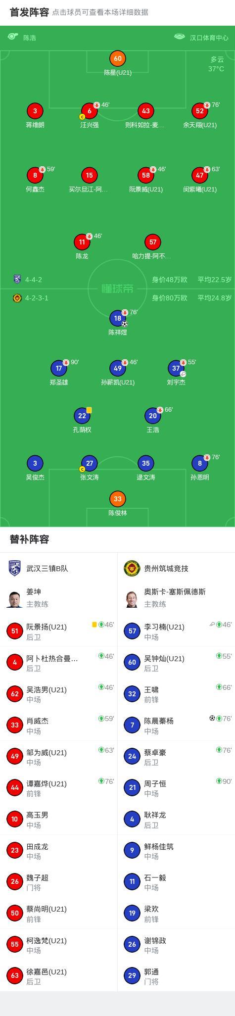 8月3日,中國足球乙級聯賽預賽階段第22輪,武漢三鎮B隊主場迎戰貴州築城競技。比賽中,貴州築城競技由劉宇傑送出助攻,陳祥煜成功破門。下半場補時階段,李習楠送出助攻,陳晨蓁楊再下一城。最終,貴州築城競技以2比0戰勝武漢三鎮B隊。