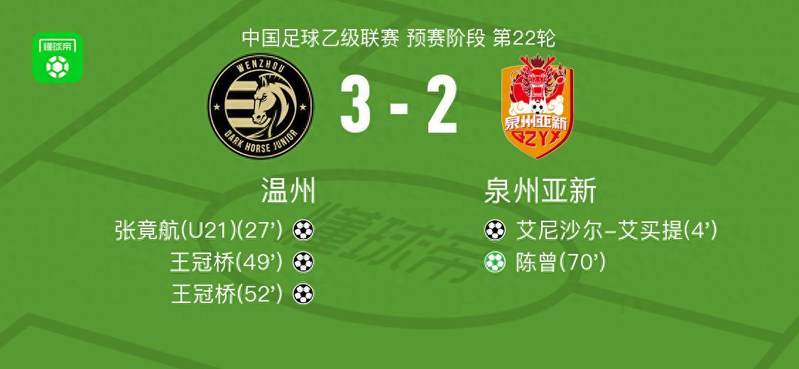 北京時間8月3日中國足球乙級聯賽 預賽階段 第22輪,溫州主場對陣泉州亞新。溫州張竟航破門,王冠橋梅開二度。泉州亞新艾尼沙爾-艾買提破門,陳曾破門。最終比分溫州 3-2 泉州亞新。