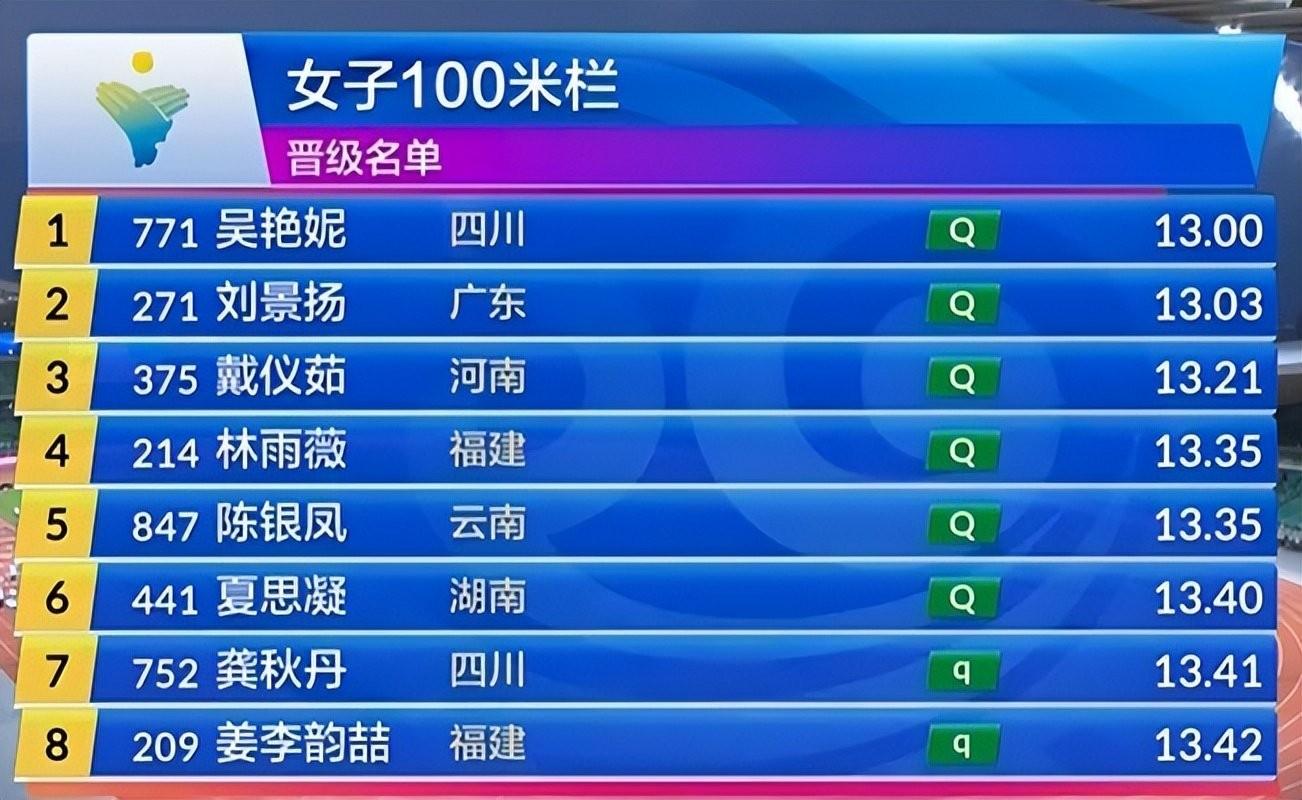 全國田徑錦標賽女子100米欄:吳豔妮13秒00位列第一,晉級決賽