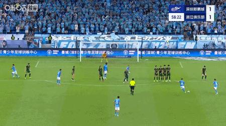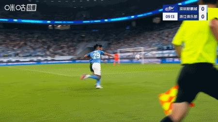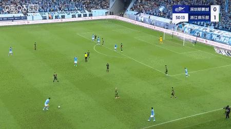 第51分鐘,楊一鳴助攻,韋斯利停球抽射破門,新鵬城1-1浙江扳平比分