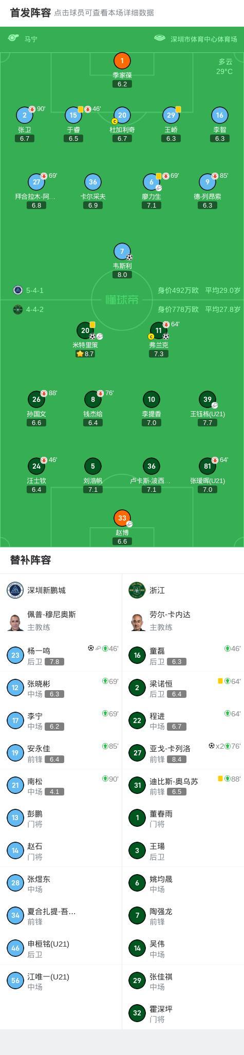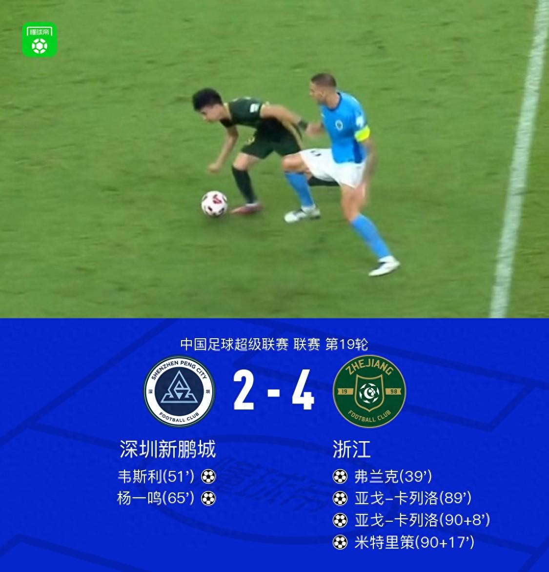 北京時間8月3日中國足球超級聯賽第19輪,深圳新鵬城坐鎮主場迎戰浙江。比賽中,浙江球員米特里策助攻弗蘭克先拔頭籌。隨後,深圳新鵬城球員楊一鳴送出助攻,韋斯利推射破門扳平比分。下半場,楊一鳴接廖力生妙傳冷靜施射反超比分。臨近終場,王鈺棟助攻亞戈-卡列洛破門再度扳平。補時階段,亞戈-卡列洛接隊友傳球完成梅開二度,隨後趙博助攻米特里策鎖定勝局。最終,深圳新鵬城2-4不敵浙江。
