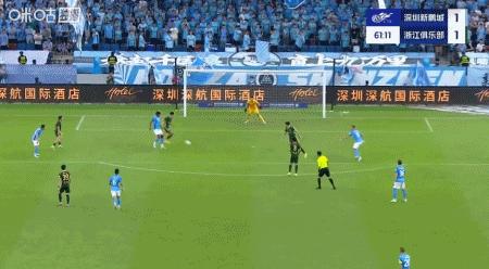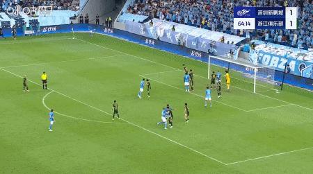 第65分鐘,廖力生角球開到後點,楊一鳴頭球破門,新鵬城2-1浙江