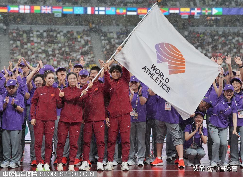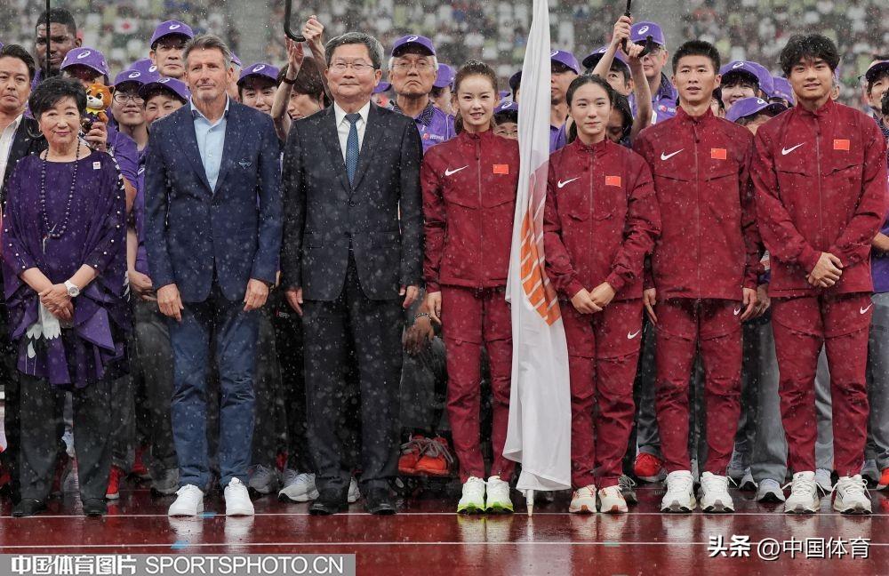 中國田徑運動員楊家玉、陳妤頡、梁寶棠、王朝朝在閉幕式上接旗