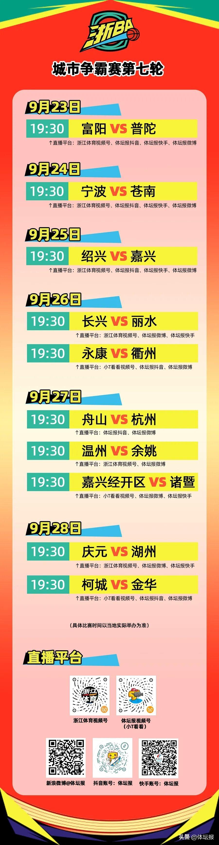 明天(9月23日)至9月28日,“浙BA”城市爭霸賽即將進入第七輪的對決,共將進行10場比賽。比賽日程如下(主場在前):