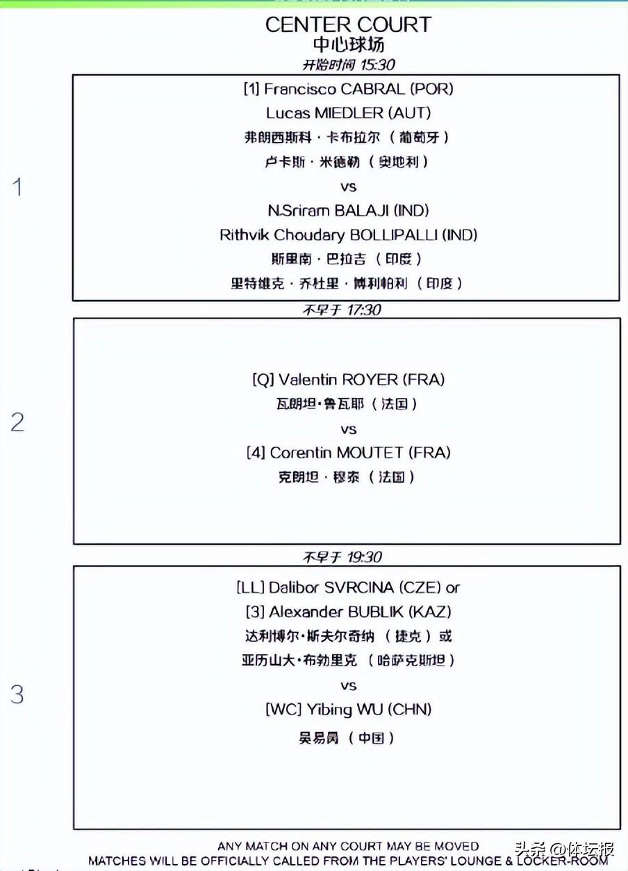 今晚的半決賽,吳易昺的對手是賽會3號種子布勃裏克。