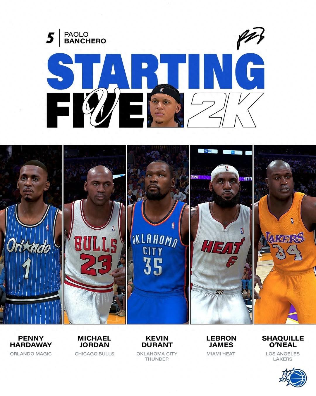 魔術隊官方Instagram列出班凱羅的選擇,他的2K首發五人組分別是:“便士”哈達威、邁克爾-喬丹、凱文-杜蘭特、勒布朗-詹姆斯和沙奎爾-奧尼爾。