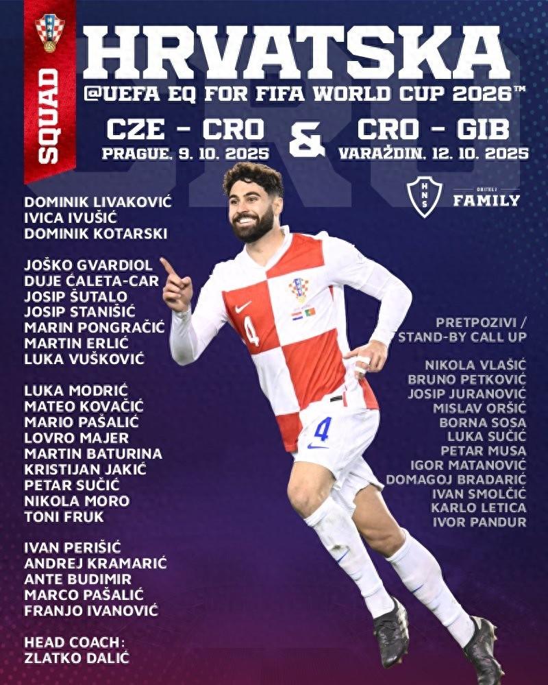 北京時間9月22日,爲了迎接10月的世預賽,克羅地亞公佈了新一期的國家隊大名單,莫德里奇、格瓦迪奧爾領銜,佩裏西奇、科瓦契奇、斯塔尼希奇入選。