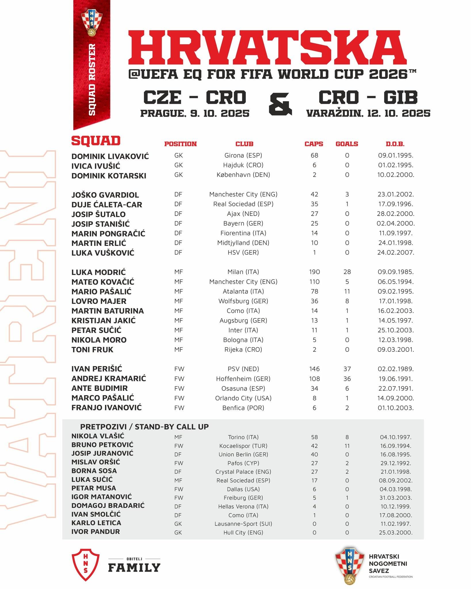 克羅地亞10月大名單:莫德里奇、格瓦迪奧爾領銜,佩裏西奇在列
