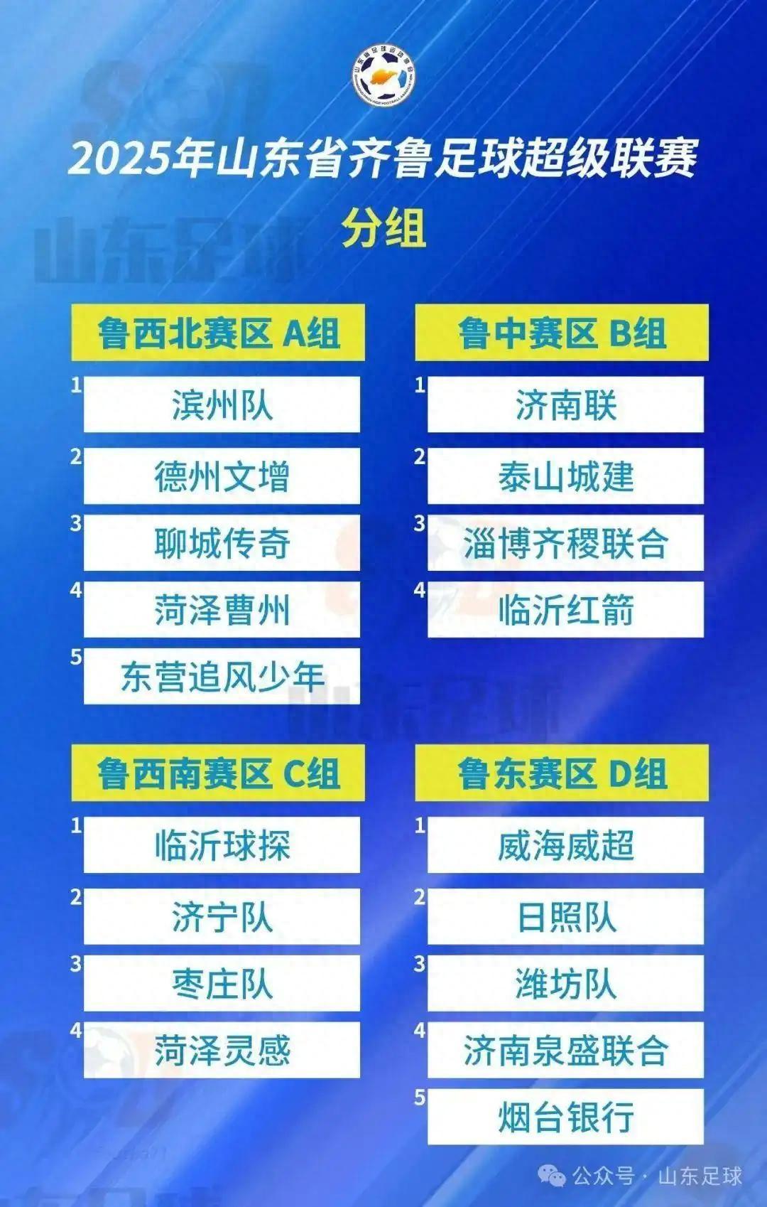2025年山東省齊魯足球超級聯賽將18支隊伍分成4個賽區進行第一階段單循環主客場小組賽,開幕式和揭幕戰將在9月12日-14日於淄博市舉行。