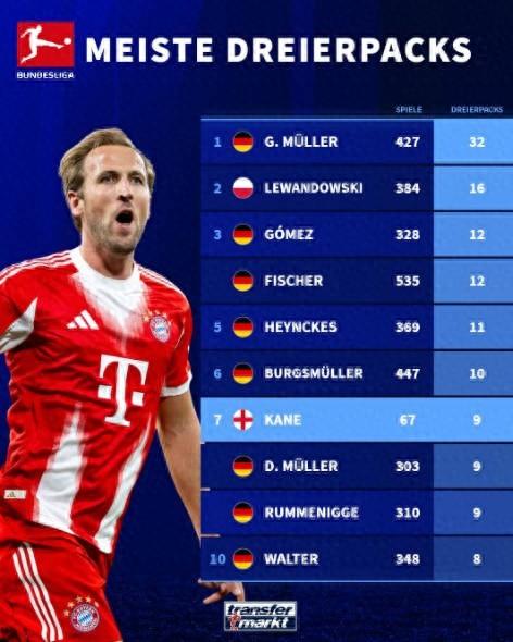 在上週拜仁客場4-1擊敗霍芬海姆的比賽中,凱恩完成了帽子戲法,北京時間9月23日,德國轉會市場列舉了德甲球員在聯賽中完成帽子戲法次數的排行榜,其中蓋德-穆勒居首,凱恩位列第七名。