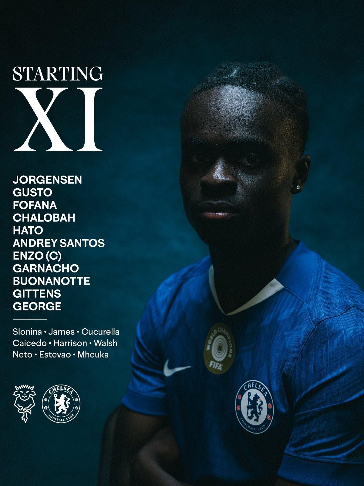 切爾西首發:12-約恩森、27-古斯托、29-韋斯利-福法納、23-查洛巴、21-哈託、17-安德雷-桑托斯、8-恩佐、49-加納喬、40-博納諾特、11-吉滕斯、32-喬治