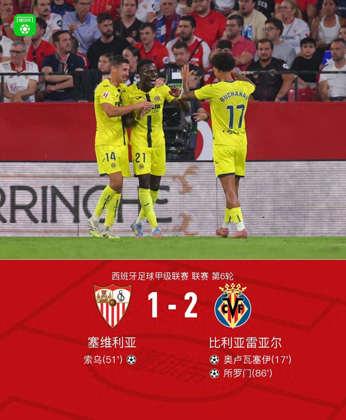 北京時間9月24日,西班牙足球甲級聯賽第6輪展開較量,塞維利亞坐鎮主場迎戰比利亞雷亞爾。比賽中,奧盧瓦塞伊接塞爾希-卡多納助攻率先破門,爲比利亞雷亞爾取得領先。隨後,索烏爲塞維利亞扳平比分。比賽進入尾聲階段,米卡塔澤送出助攻,所羅門建功,幫助比利亞雷亞爾再度超出比分。最終,全場比分定格爲塞維利亞1-2比利亞雷亞爾。