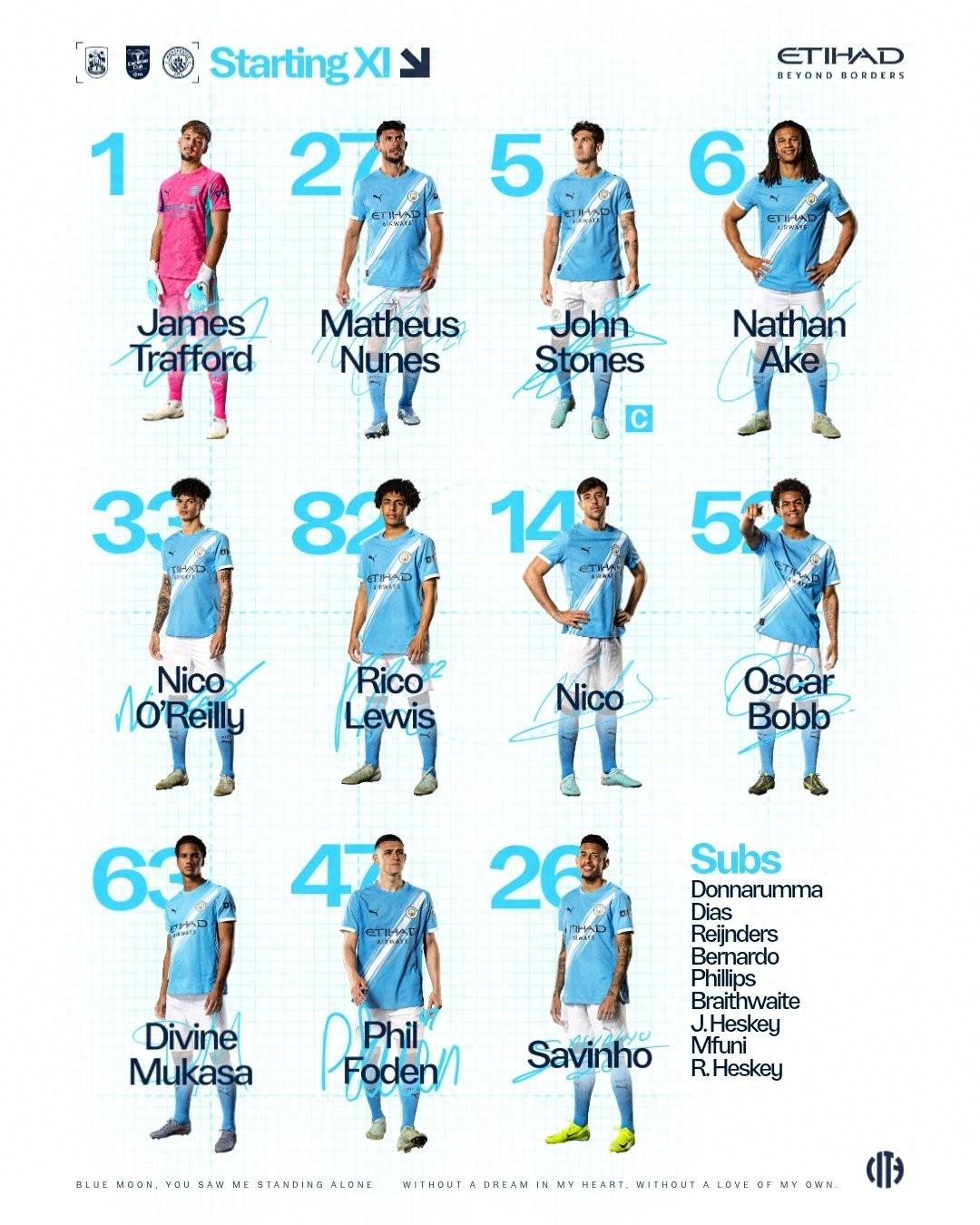 曼城首發:1-特拉福德、27-馬特烏斯-努內斯、5-斯通斯、6-阿克、33-尼科-奧賴利、82-里科-劉易斯、14-尼科-岡薩雷斯、52-奧斯卡-鮑勃、63-穆卡薩、47-福登、26-薩維尼奧