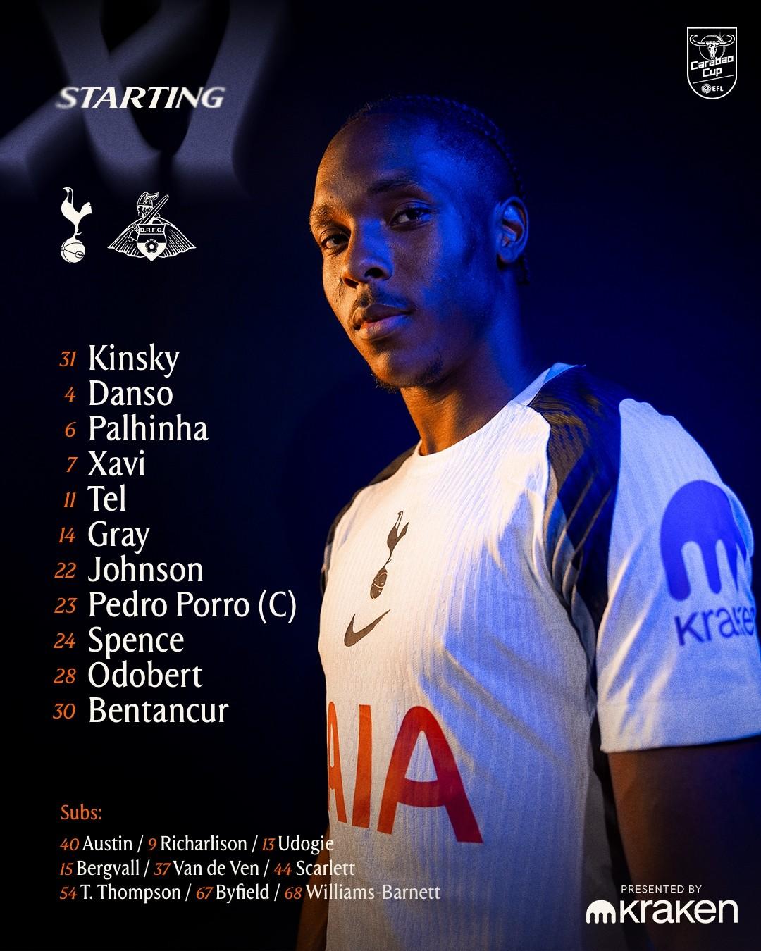 托特納姆熱刺首發:31-金斯基、23-波羅、4-凱文-丹索、30-本坦庫爾、24-斯彭斯、6-帕利尼亞、14-阿奇-格雷、7-哈維-西蒙斯、28-奧多貝爾、11-馬蒂斯-特爾、22-布倫南-約翰遜