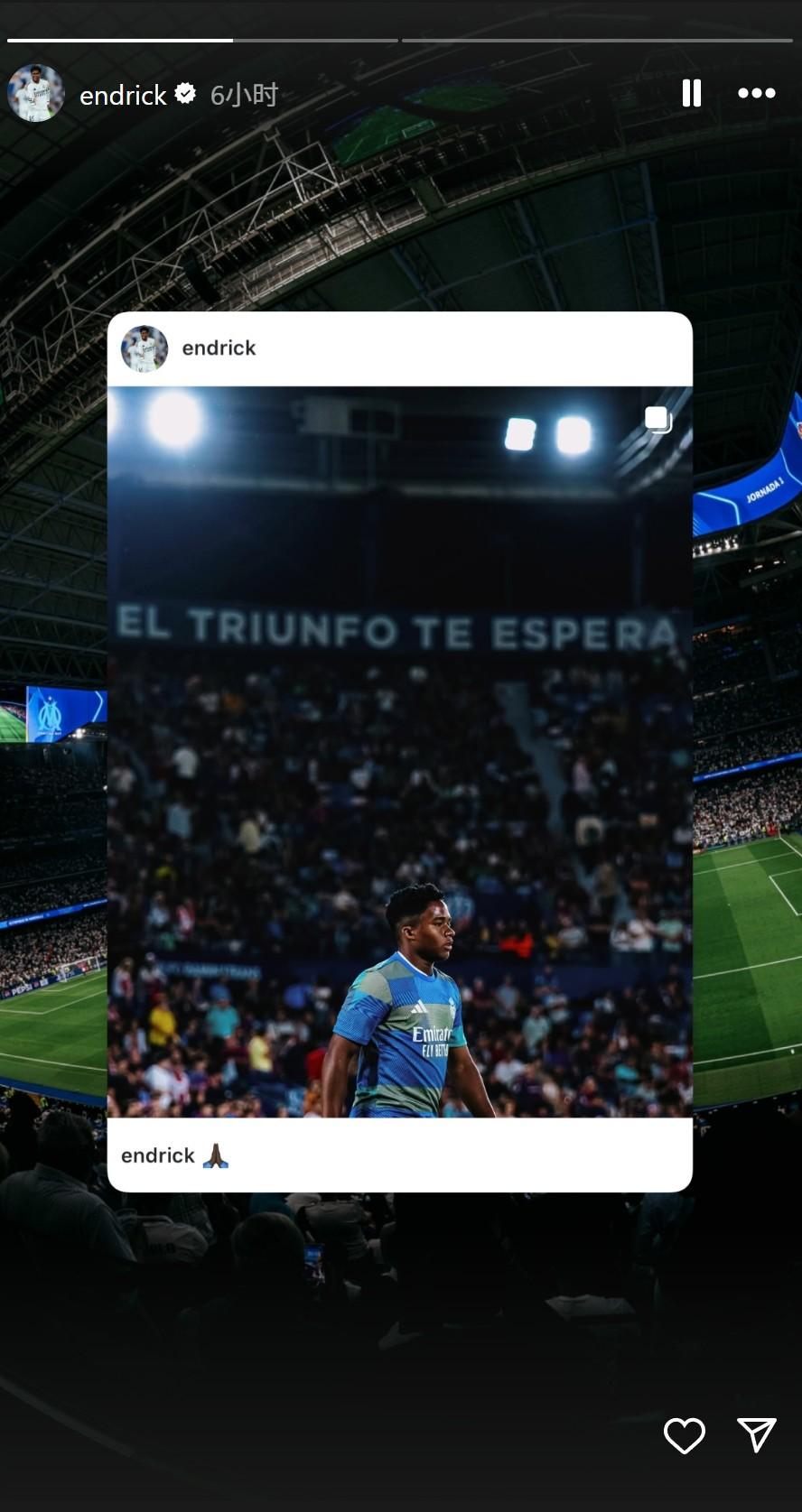 “但問題在於,恩德里克本人以及他的團隊並不同意這個方案。事實上,他們明確希望繼續留在皇家馬德里。比如今天,恩德里克還在社媒上發了一張照片,背景是聖地亞哥伯納烏球場的一塊牌子,上面寫着‘勝利在等你’,這無疑是他想留隊的一種表態。”