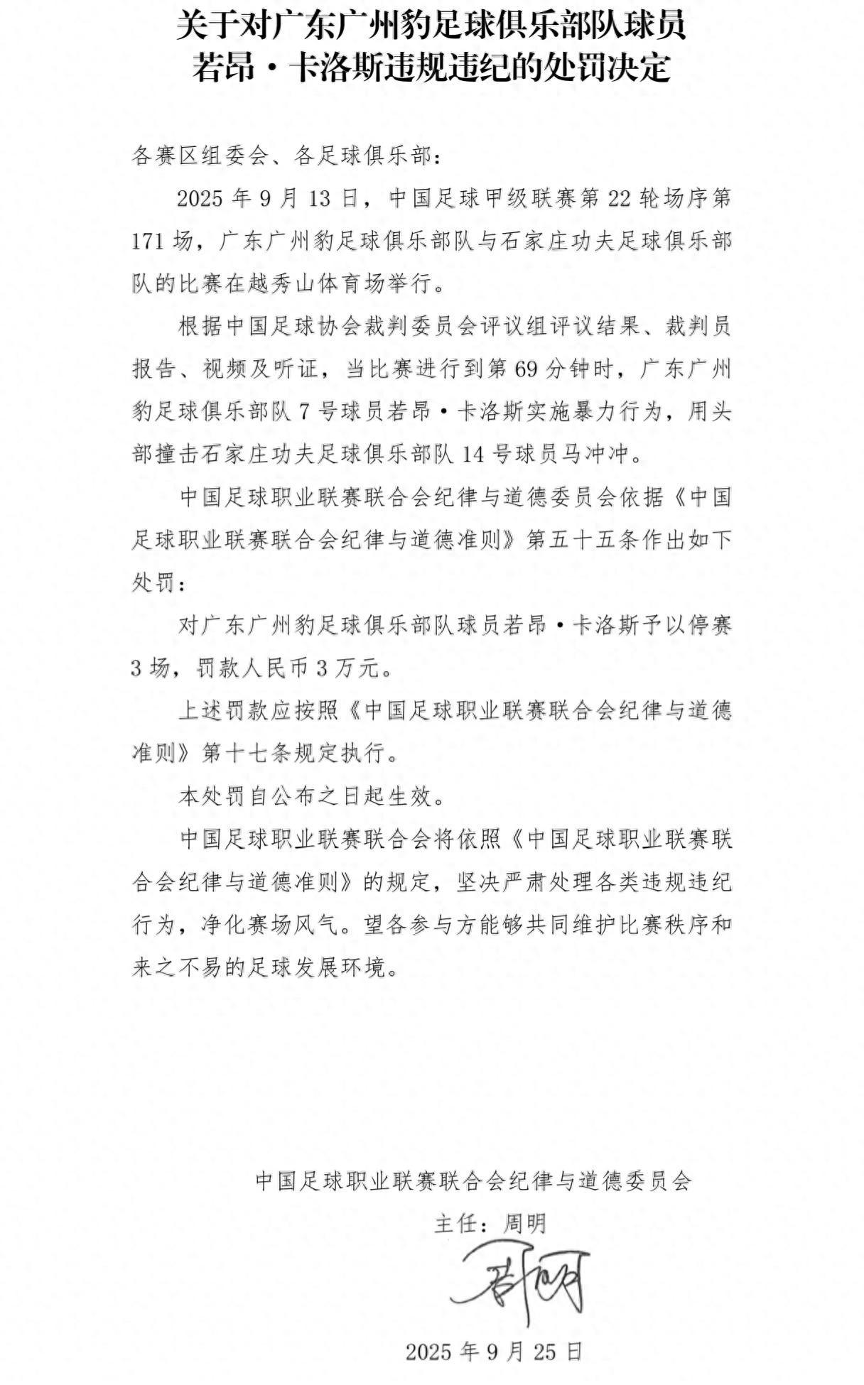 北京時間9月26日,中國足球職業聯賽聯合會官方發佈處罰公告,廣州豹外援若昂-卡洛斯因用頭撞擊對手被禁賽3場+罰款3萬。