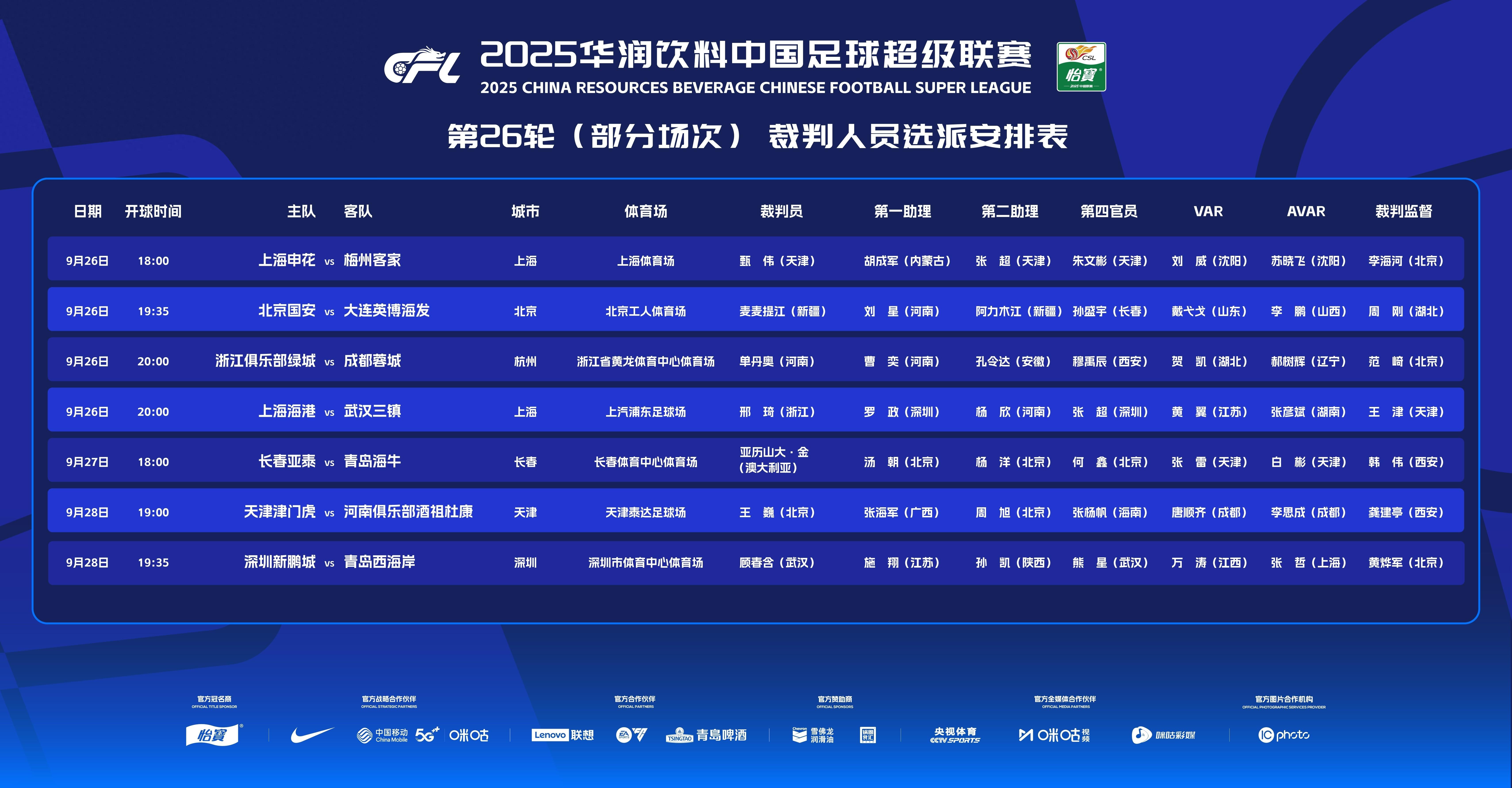 北京時間9月26日,中超第26輪(部分場次)的裁判名單公佈,麥麥提江執法國安vs英博,亞歷山大-金吹亞泰vs海牛。