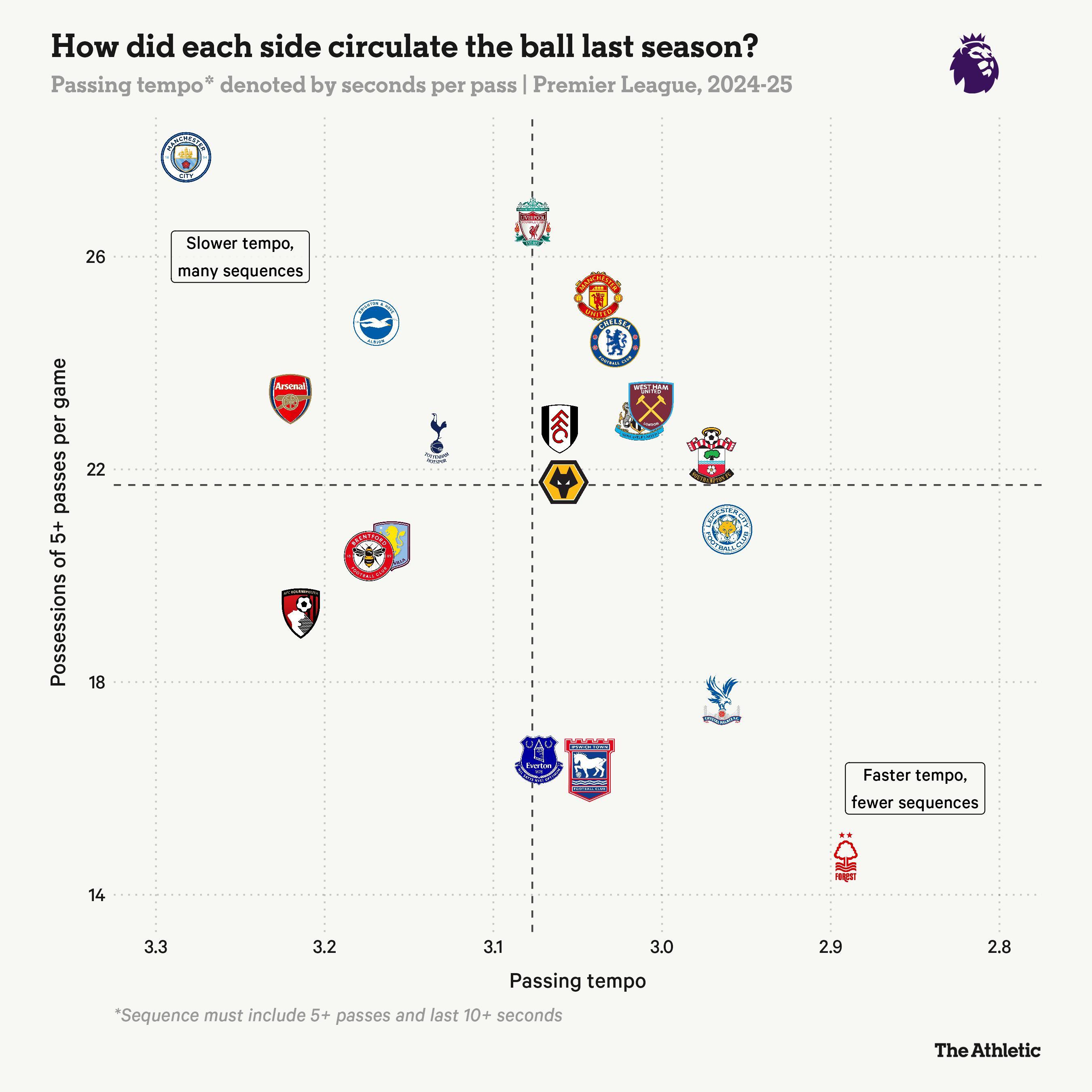 在2024-25賽季英超聯賽的兩端分別是曼城和諾丁漢森林。前者在瓜迪奧拉執教下的控球風格儘管未能贏得獎盃,依然是聯盟中的異類;後者在努諾的帶領下雖然控球機會較少,但控球時卻能快速而有目的地傳遞。