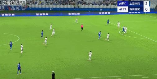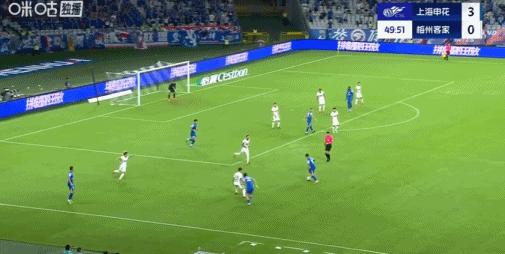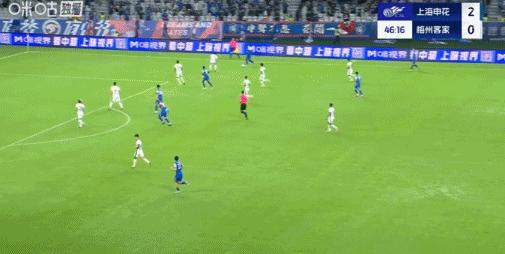 第47分鐘,阿蘇埃踩單車後送妙傳,劉誠宇破門,申花3-0梅州