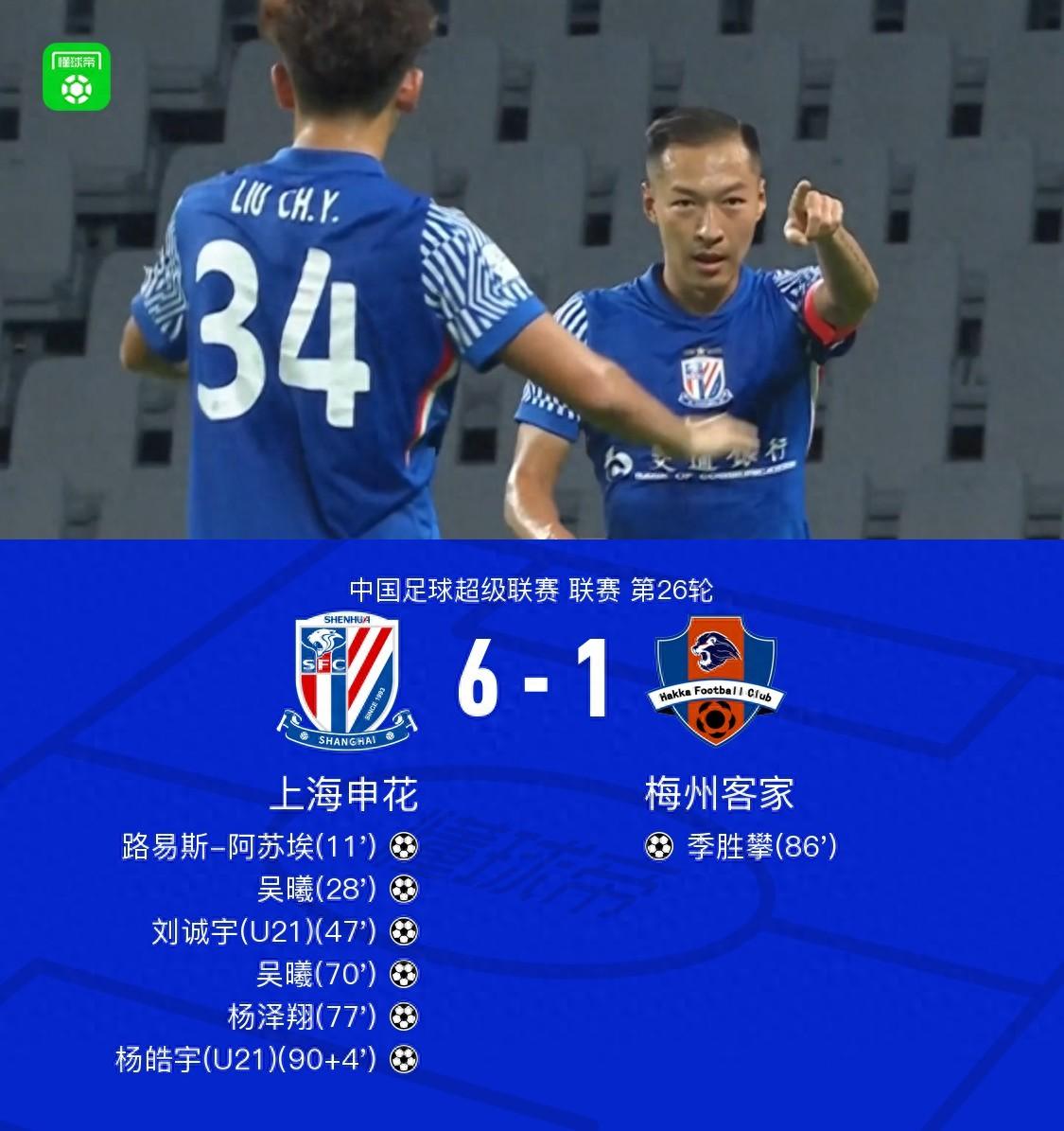 北京時間9月26日,中國足球超級聯賽第26輪展開角逐,上海申花坐鎮主場迎戰梅州客家。上半場阿蘇埃射門被擋後補射破門,之後馬納法傳球,吳曦插上後輕巧墊射破門。下半場阿蘇埃踩單車後送妙傳,劉誠宇破門,之後朱辰傑搶斷後直塞,吳曦破門完成雙響,隨後于漢超挑傳,楊澤翔推射破門,比賽尾聲奧馬爾松射門中框,季勝攀補射破門扳回一球,補時階段于漢超無私助攻楊皓宇破門。最終申花6-1大勝梅州。