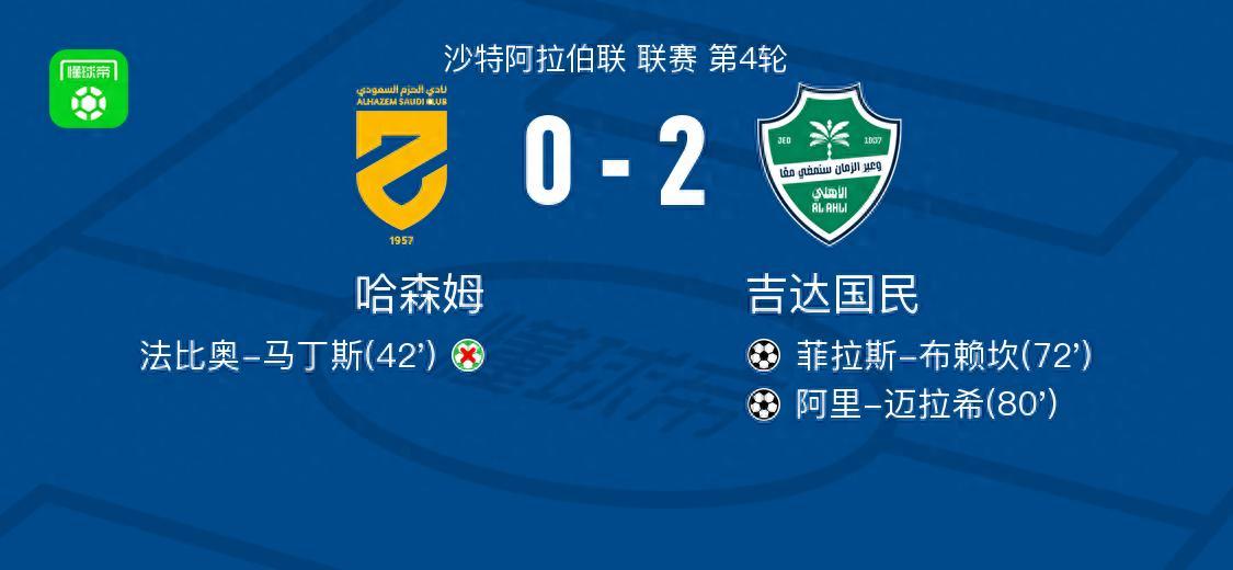 北京時間9月26日,沙特阿拉伯聯聯賽第4輪,哈森姆主場迎戰吉達國民。比賽中,哈森姆球員法比奧-馬丁斯在上半場主罰點球未能命中,錯失得分良機。下半場,吉達國民率先打破僵局,阿里-邁拉希送出助攻,菲拉斯-布賴坎冷靜破門,幫助球隊取得領先。隨後,馬特烏斯-貢薩爾維斯送出關鍵傳球,阿里-邁拉希跟進推射得手,進一步擴大比分優勢。最終,吉達國民以2比0客場戰勝哈森姆,全取三分。