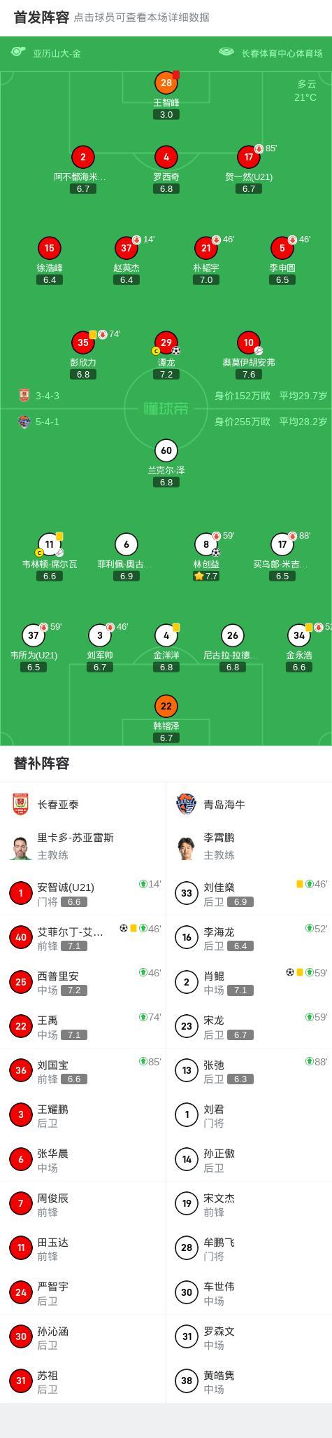 北京時間9月27日,中國足球超級聯賽第26輪展開較量,長春亞泰主場迎戰青島海牛。上半場王智峯被紅牌罰下,林創益任意球攻破對方球門,下半場韋林頓-席爾瓦送出助攻,肖鯤推射得手,補時階段奧莫伊胡安弗送出關鍵傳球,譚龍門前冷靜破門扳回一城,傷停補時最後時刻,艾菲爾丁-艾斯卡爾打入絕平進球。最終雙方2比2握手言和。