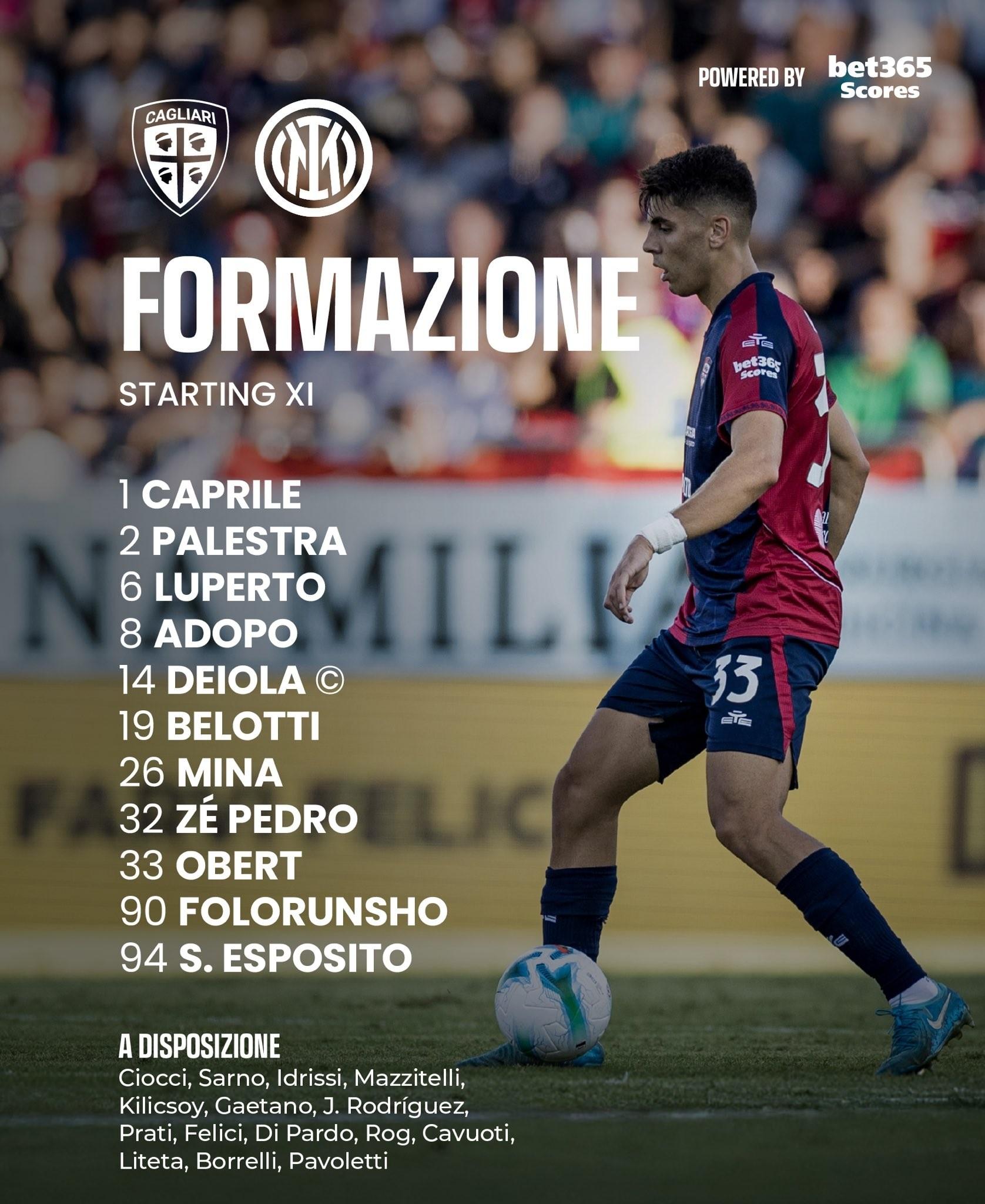 卡利亞里首發:1卡普里萊、32-澤-佩德羅、26-米納、6-盧佩爾託、2-帕萊斯特拉、8-阿多波、14-迪奧拉、90-弗洛倫肖、33-奧伯特、94-塞巴斯蒂亞諾-埃斯波西託、19-貝洛蒂