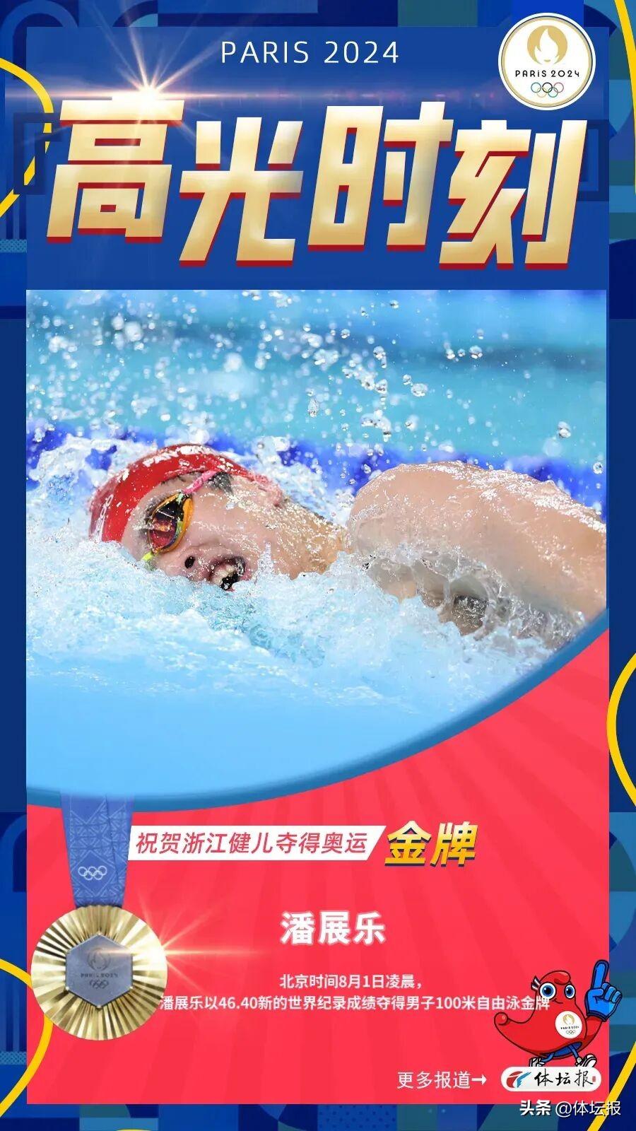 潘展樂,男,浙江體育職業技術學院游泳系運動員,國際健將。第33屆夏季奧運會男子100米自由泳和男子4×100米混合泳接力冠軍,並打破男子100米自由泳世界紀錄。作爲浙江游泳的新生代運動員,潘展樂以敢於一馬當先的豪情詮釋着新時代青年的責任與擔當,也爲“幹在實處、走在前列、勇立潮頭”的浙江精神寫下了生動的註腳。