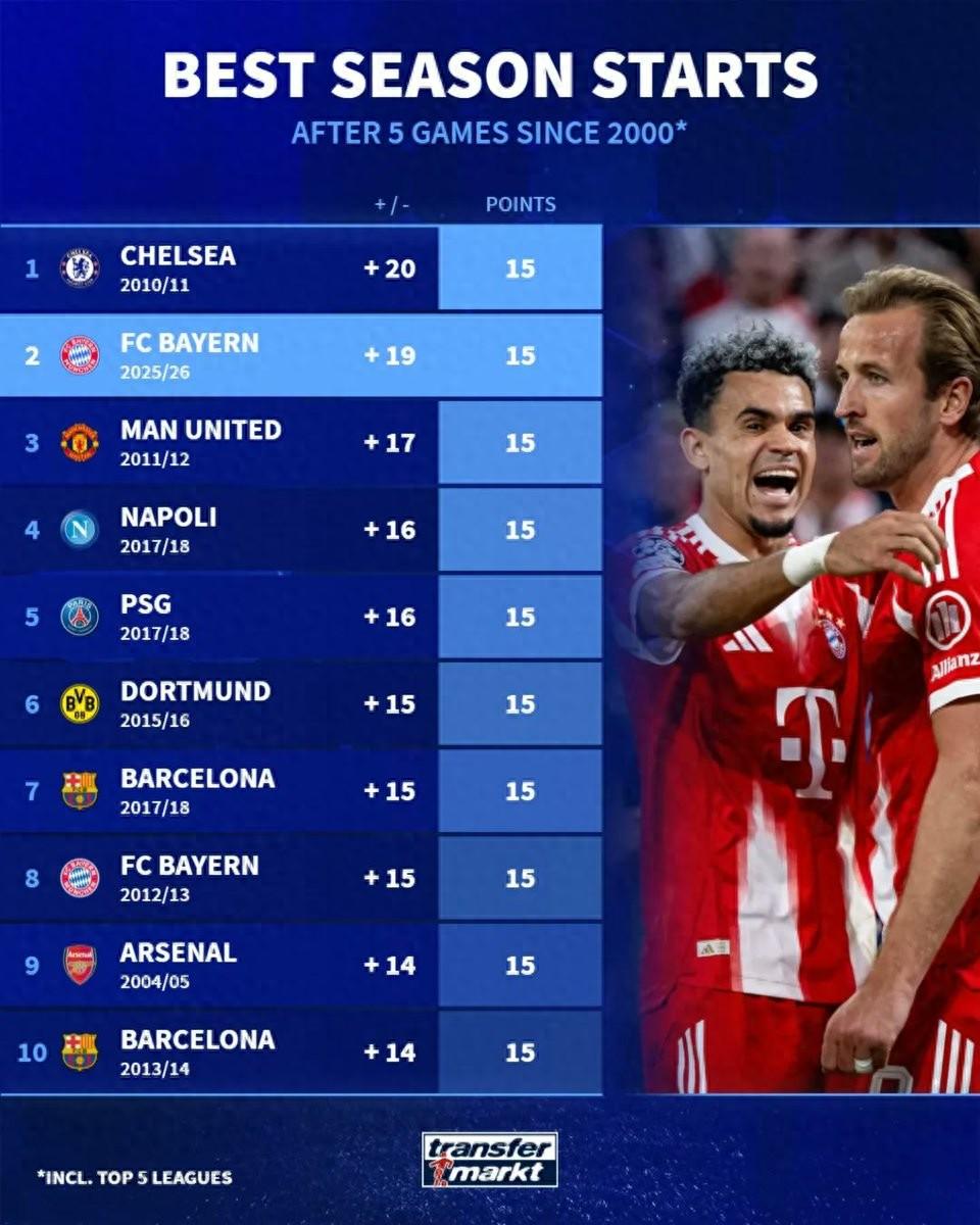 拜仁本賽季德甲前五輪全勝,淨勝球爲+19,這是自2000年以來五大聯賽賽季前五輪第二好開局。